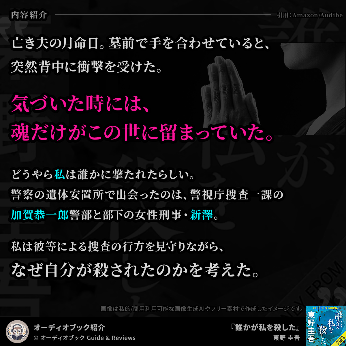 『誰かが私を殺した』(東野 圭吾)をAudibleで聴いたので作品内容や注目ポイントを紹介します。