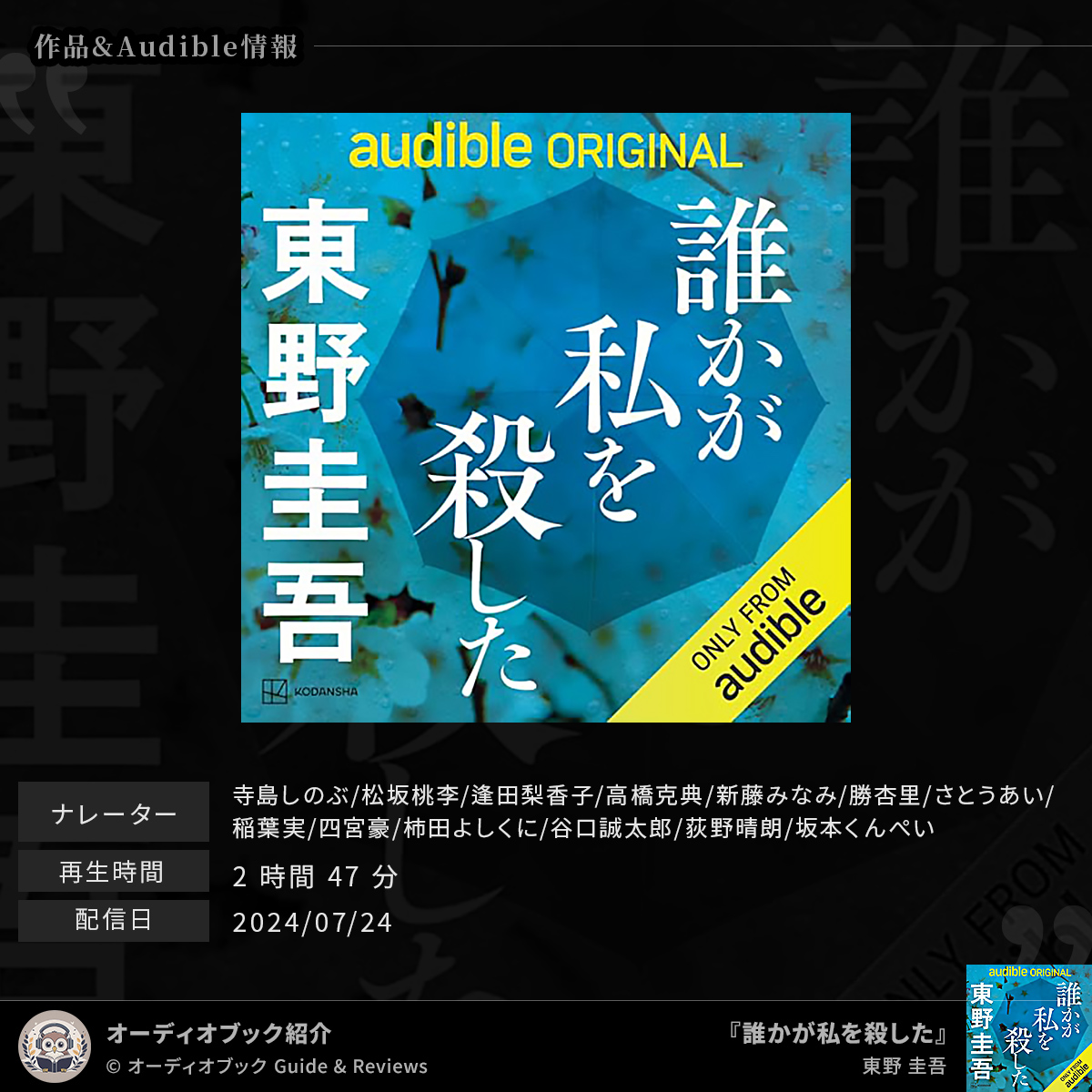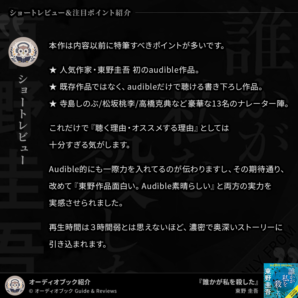 Audible的にも一際力を入れてるのが伝わりますし、その期待通り、改めて『東野作品面白い。Audible素晴らしい』と両方の実力を実感させられました。