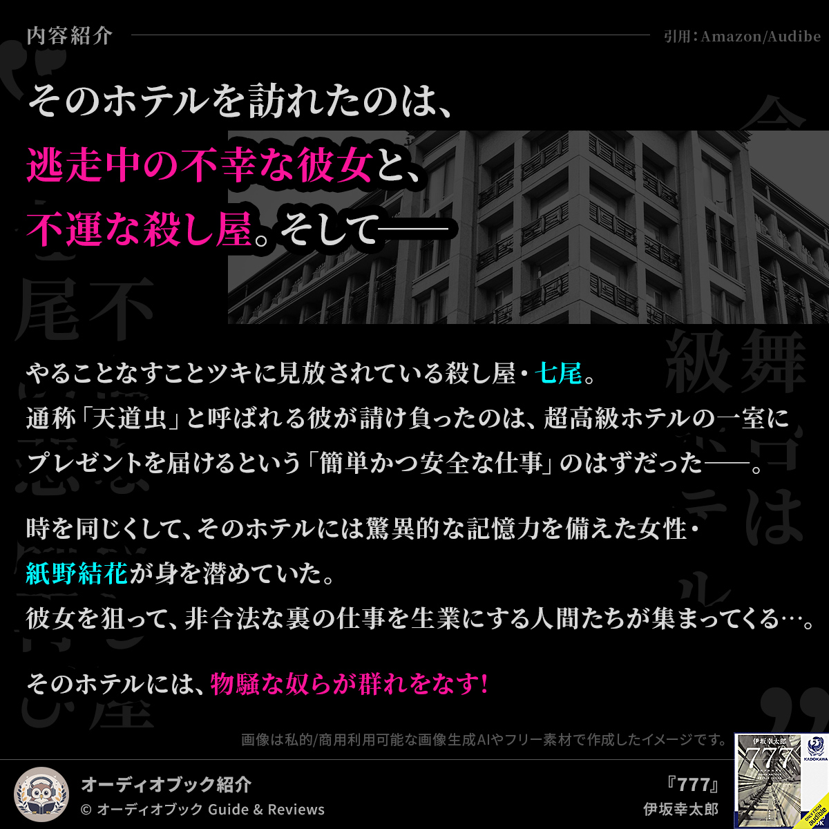 『777(トリプルセブン)』(伊坂幸太郎 著)をAudibleで聴いたので作品内容や注目ポイントを紹介します。