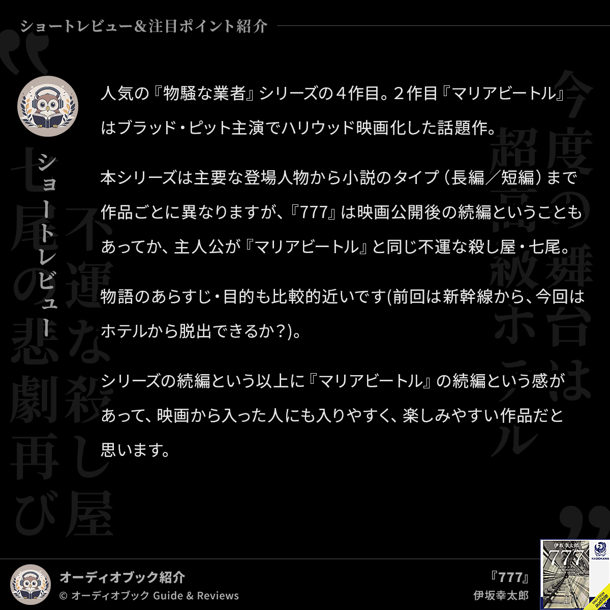 登場人物(七尾)が同じですし『② マリアビートル』を聴いてすぐに『④ 777』を聴いたら、もしかしたら違和感があるかもしれません。