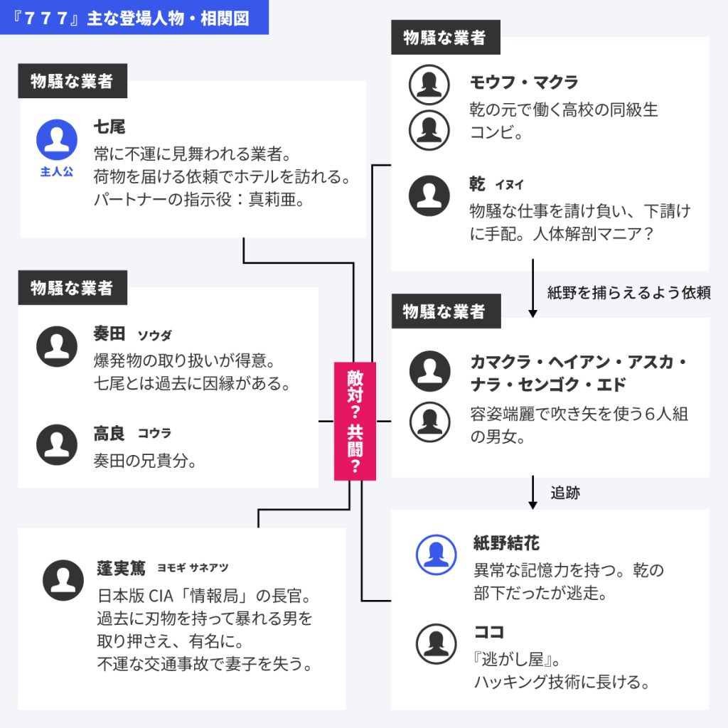 本シリーズは主要な登場人物から小説のタイプ(長編/短編)まで作品ごとに異なりますが、『777』は映画公開後の続編ということもあってか、主人公が『マリアビートル』と同じ不運な殺し屋・七尾。